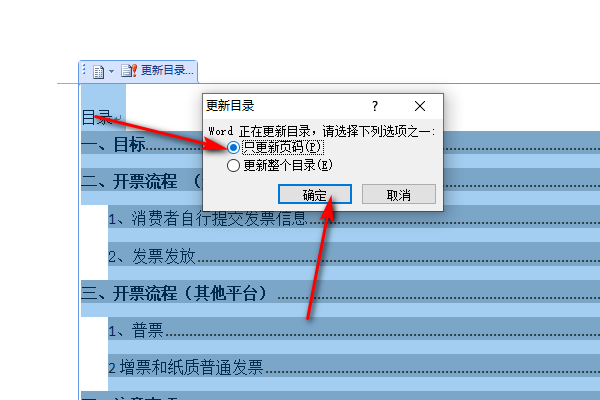 4、接着在弹出来的更新目录里面勾选只更新页码,点击确定即可。