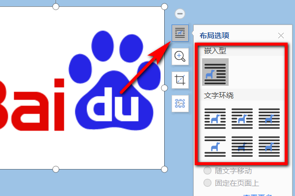 4、嵌入型的图片无法在页面中更改位置,如果需要更改其他文字环绕的方式,可以在同样的布局按钮内选择。