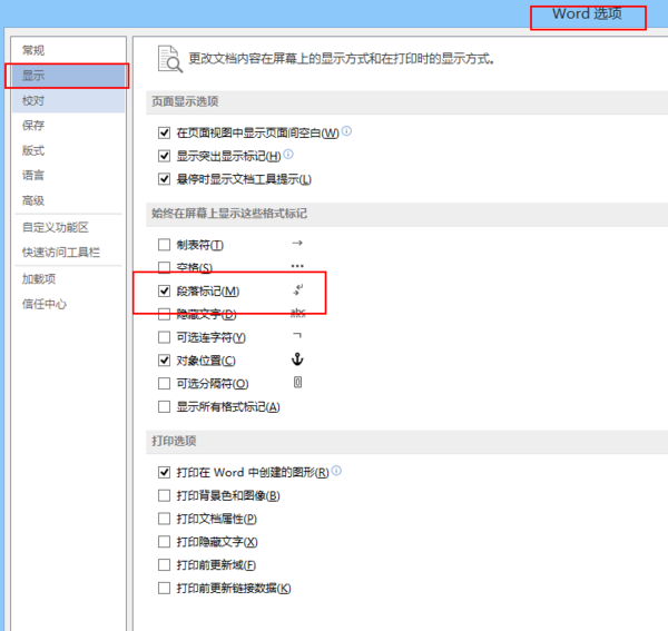 4.此时就会弹出一个窗口,在左侧的目录下点击显示,并在右边找到段落标记。