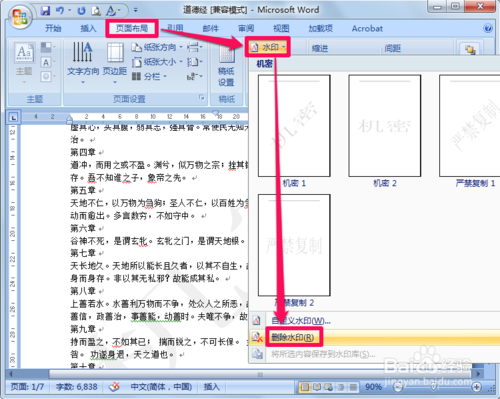 首先选择页面布局,然后点击水印,在弹出的选项中可以快速选择常用的水印:机密或者是严禁复制。