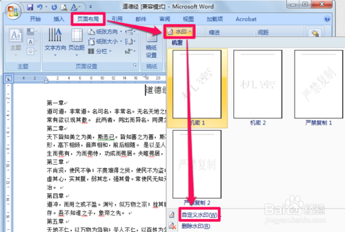 如果想自定义水印,就在页面布局中选择“水印-自定义水印”