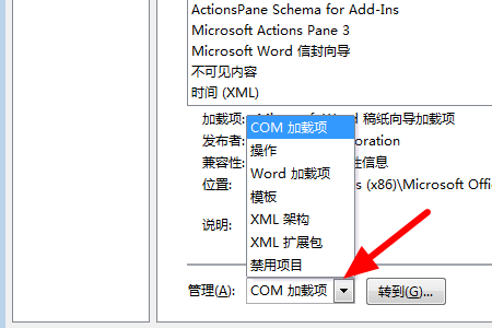2、然后我们在弹出来的窗口中点击打开加载项中的“管理”,选择“COM加载项”,之后点击后面的“转到”。