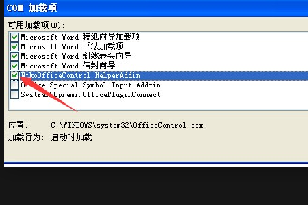 3、然后我们在弹出来的窗口中点击取消打勾“ntkoofficecontrol helperaddin”,回车确定即可。