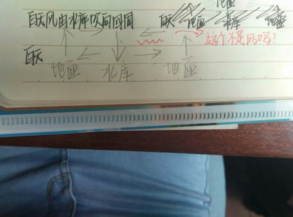 水库相当于海洋,比热容大于陆地,所以白天升温慢,气温比陆地低。水库气温低,气流下沉,近地面形成高压。陆地气温高,气流上升形成低压。风从高压区吹向低压区。