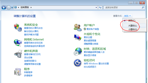 2、在控制面板窗口的右上角,在查看方式中,选择“大图标”: