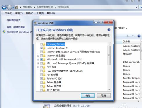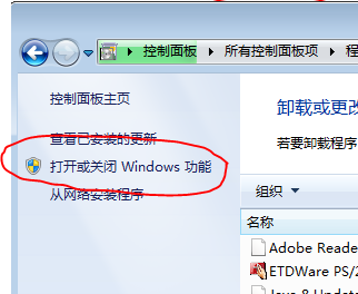 在windows7中也是相似的,在控制面板中找到”程序和功能,之后使用“打开或关闭windows功能”