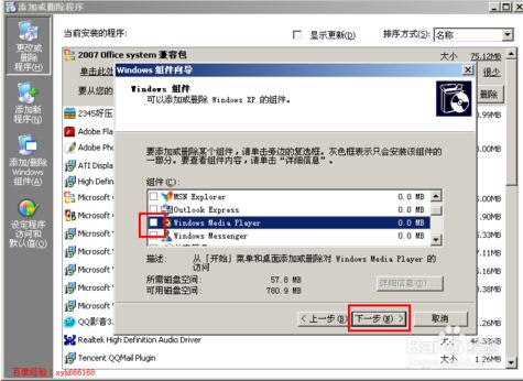 3、去掉windows media player的勾选,点下一步