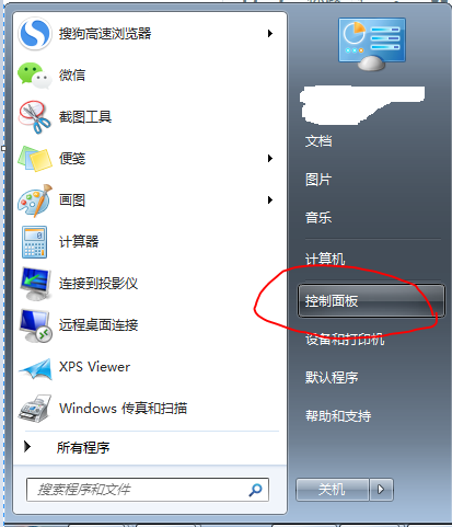 依次点击并打开:电脑左下角的“开始”-----“控制面板”,打开控制面板程序