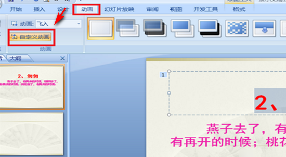 5、很多的课件中的文字都会进入和退出,使用动画设计,在菜单栏中找到“动画”,单击一下,在下方出现自定义动画,单击一下。