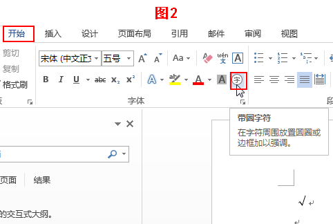 (2)复制刚才输入的对勾符号,把光标移到文档其他位置,打开“开始”菜单下的“带圈字符”命令。如图2所示。