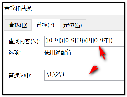 查找内容输入:([0-9])([0-9]{3})([!0-9 .年])