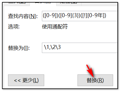 “查找内容”中填入: ([0-9])([0-9]{3})([!][0-9年]),“替换为”中填入:\1,\2\3,