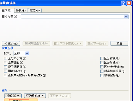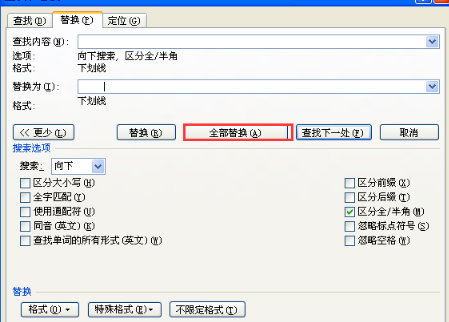 4、选择替换选项卡,在替换为输入框中输入若干个空格,单击格式按钮,在下拉选项中选择字体,重复第3步操作,单击全部替换按钮即可,如图所示。