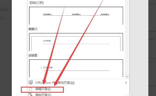 4、点击“页眉”之后,就会出现一个下拉菜单,选择其中“编辑页眉”命令。