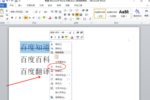 1、打开需要操作的WORD文档,选中相关文本,点击鼠标右键,并在右键菜单张选择“字体”。