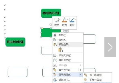因为需要在形状中输入文字,所以需要将形状设置衬于文字之下,选中并单击形状,在菜单中鼠标指向“置于底层”,在次级菜单中选择“衬于文字下方”。