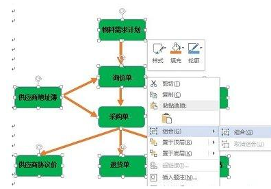 上面一切都完成后,全选所有的形状,右击,在右键菜单中鼠标指向“组合”,在次级菜单中选择“组合”。