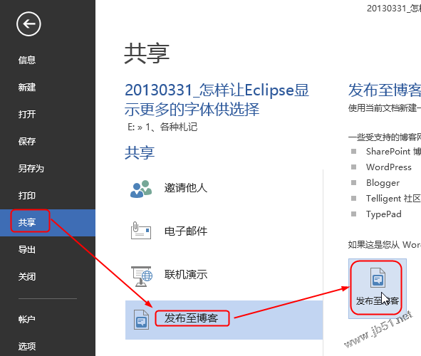 打开一篇Word文档,然后点击左上角的“文件”,依次选择“共享”-->“发布至博客”: