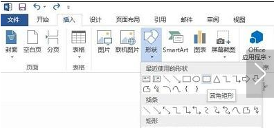 打开Word 2013软件,单击“插入”按钮,在插图功能区,点击“形状”,选择希望插入的形状,这里选择“圆角矩形”。