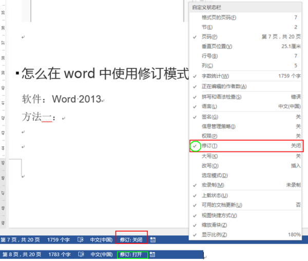 在word页面的底部的状态栏,找到【修订:关闭】,鼠标左键单击,待变为【修订:打开】状态时,即为修订模式,再点击一次为关闭修订模式。。在状态栏找不到【修订:关闭】,可在状态栏鼠标右键勾选”修订”,即可在状态栏显示出来。