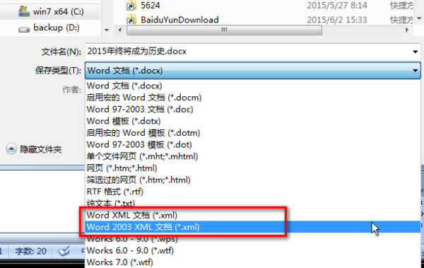 4、然后会进入到保存的对话框中,在文件类型选项栏中选择“Word XML”的格式。