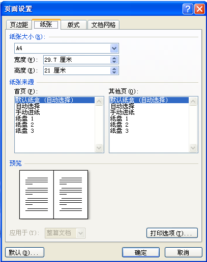 3、选择纸张选项卡,在纸张大小处选择A4;