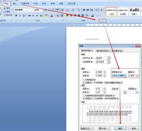 选中区域——开始——段落——特殊格式(选首行缩进)——磅值(2个字符)——确定,如图: