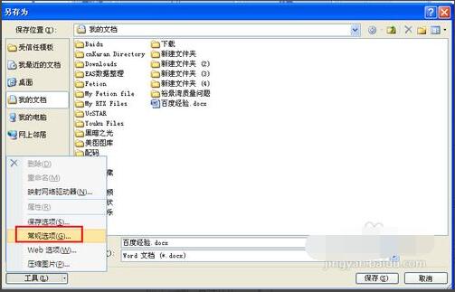 2、选“文件”的“另存为”,出现“另存为”对话框,在“工具”中选“常规选项”,出现“保存”选项卡。