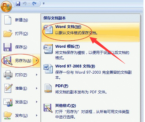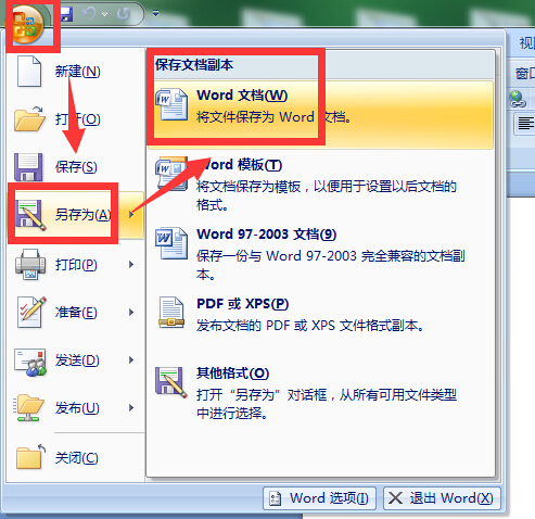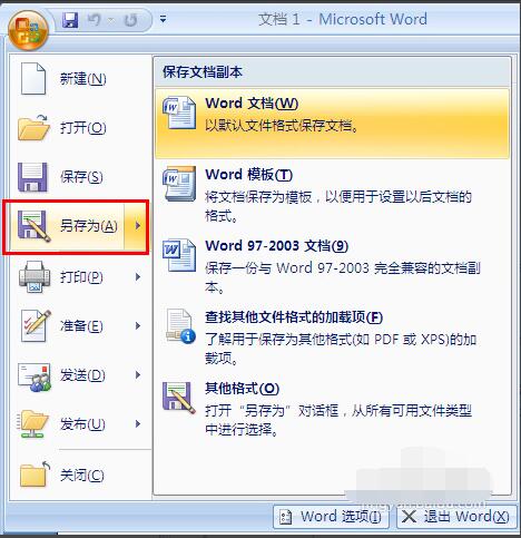 打开word2007之后,点击左上角的office图标,选择“另存为”里的“word文档”;