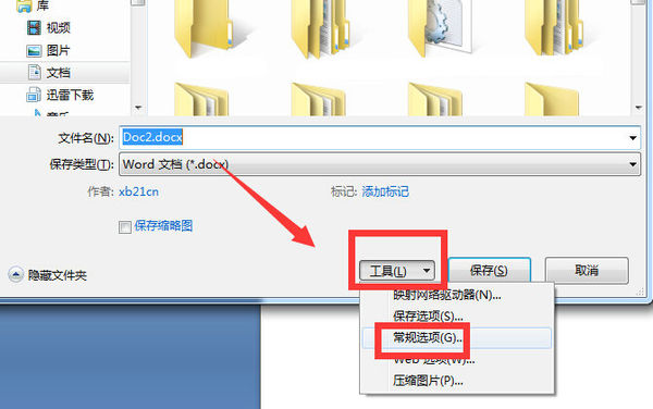 2、在“另存为”对话框中单击下面的“工具”按钮,在下拉菜单中选择“常规选项”;
