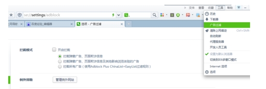 但有时我们会用到其它浏览器,这时就需要在非IE浏览器中也进行设置才可以,如我用的360浏览器,我们需要点击工具--广告过滤,去掉开启拦截的勾选项。