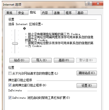 首先,我们在IE中设置,点击工具---internet选项,点开“隐私”页面,可以看到弹出窗口阻止程序,我们可以将勾选去掉。或者点设置来增加阻止程序所允许的网址。
