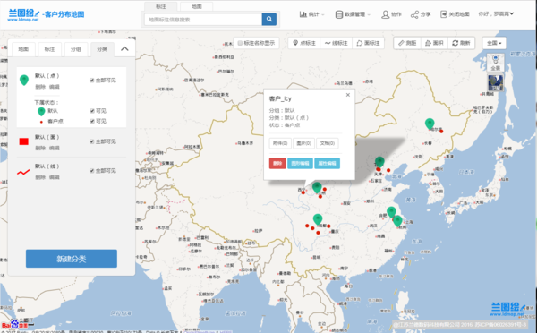 兰图绘是一款基于百度地图的标会平台,向中小企业及个人提供互联网地图标绘服务。用户可在本平台提供的网络地图上,根据需求绘制相应的点、线、面标注,以及对这些标注进行统计分析