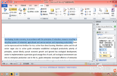 或者是直接点击翻译的下拉菜单,点击【翻译所选文字】,然后右边就会出现翻译后的文字啦,如果想看得明显一些,可以点击【插入】下的【复制】复制到文档中