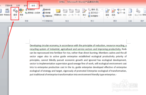 首先打开我们的word文档,切换到【审阅】选项卡,找到【翻译】