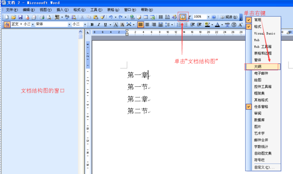 1、在工具栏中任意处单击鼠标右键,单击快捷菜单中的“大纲”,使前面打上“√”,将“大纲”工具栏显示出来;点击工具栏上的“文档结构图”图标,将文档结构图显示在左侧;