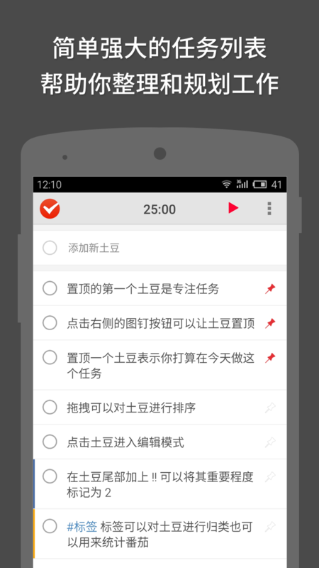 番茄土豆是番茄工作法和 To-do List 工具,它可以帮助你计划、管理、执行、记录工作。现在就开始使用番茄土豆,完成了不起的工作!