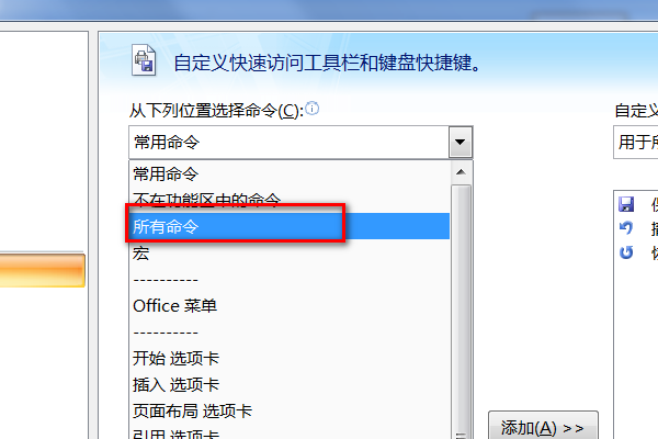 2、从下列位置选择命令,选择“所有命令”。
