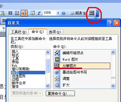 单击工具菜单——“自定义”命令,弹出"自定义"对话框,在"命令"选项卡左侧"类别"列表中单击"绘图",然后从右侧的命令列表中找到"分解图片"命令