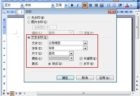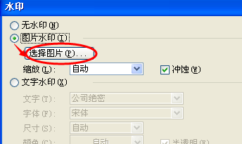 菜单栏——格式——背景——水印。这里可以选择图片水印或文字水印两种。看你需求。