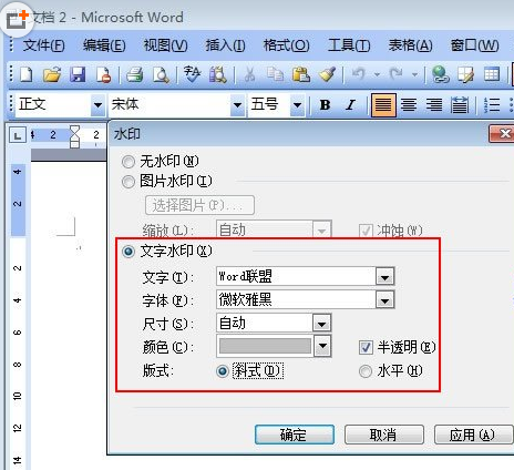 “格式”菜单——“背景“——“水印“,选择”文字水印“,输入自己想的的文字,颜色等,