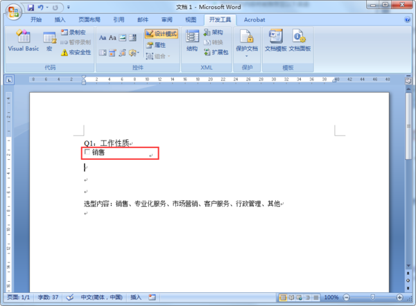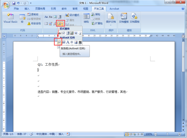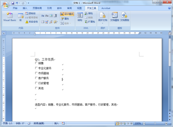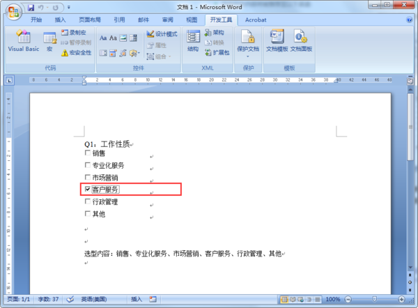以2007版WORD为例,在下图中的“工作性质”下面设置选项,在选项前设置方框且通过点击选项自动在前面的方框中打勾