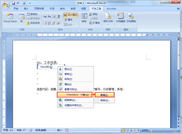 3、修改:右键单击它,再单击弹出快捷菜单的“复选框 对象/编辑”后,将显示的标题改为你需要的文字,如将“CheckBox1”修改为“同意”,“CheckBox2”修改为“反对”。