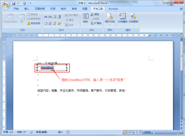 4、复选框进入编辑状态后,将原有的“CheckBox1”字样更改为第一个选项“销售”。