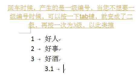 回车时候,产生的是一级编号,当您不想要一级编号时候,可以按一下tab键,就变成了二级,再按一次为3级,以此类推