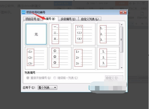 3、在打开的“项目符号和编号”对话框中选择“多级编号”选项并选择其中需要的编号样式。