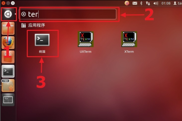 4、单击Ubuntu桌面左上边的Dash主页图标,在搜索框内输入“ter”,在搜索结果内会出现终端的图标,单击终端图标即可打开应用程序。