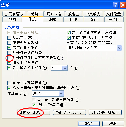2、选择常规选项卡,去掉打开时更新自动方式的链接复选框的对勾,并单击右下角的服务选项按钮,如图所示;