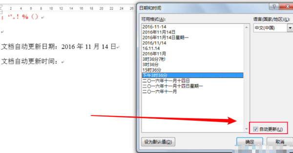 3、选择一种日期格式,自动更新划上钩,中文,确定。选择一种时间格式,自动更新划上钩,中文,确定。