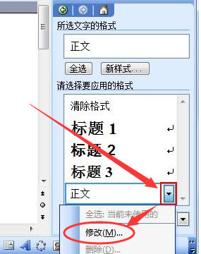 2、这时在Word界面的右侧会弹出【样式和格式任务窗格】,单击正文的小箭头,选择“修改”。